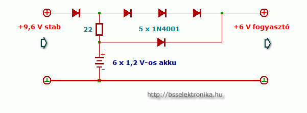 Folyamatos tápellátást igénylő készülékek áramellátását oldhatjátok meg e roppant egyszerű kapcsolással. Tulajdonképpen lehet egy stabilizált tápegység kiegészítése. A 22 ohmos ellenállás biztosítja az akkupakk töltését, értéke a mindenkori akku töltőáramától függ. Ha nagyrészt hálózati áramról üzemelünk, célszerű az akkut csepptöltésre állítani, de beépíthetünk az ellenállás helyére egy komplett automata töltőt is, tovább kombinálva: stabilizált táp+akkutöltő+akku=automata szünetmentes tápegység. Bármilyen feszültségre megépíthető figyelembe véve a diódákon eső feszültséget (diódánként 0.7V). Működése teljesen automatikus.