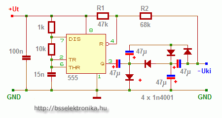 A kapcsolás tápfeszültségének +5...+12V között kell lennie. A kimenetén ugyan ekkora, de ellentétes polaritású feszültség jelenik meg. Ennek a nagyságát meg lehet változtatni az R1 vagy az R2 ellenállás értékének változtatásával. Az R2 a kimenő feszültség érzékelője, tehát ha a kapcsolás után további szűrés van, akkor ennek az ellenállásnak oda kell csatlakoznia.