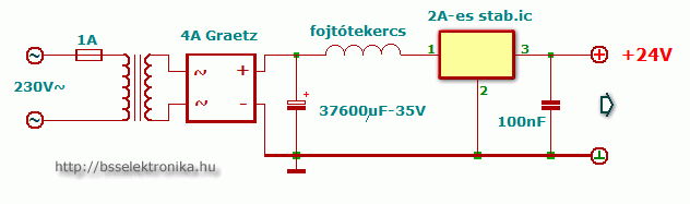 35VA, 18V-os trafó, 37600uF pufferkondi, plusz egy fojtó, amit tapasztalati úton, egy 1x2x8 cm-es lemezelt vasmagra, 1mm-es, 30m hosszú, lakkozott trafóhuzalból tekertem. Ez a fojtó elbírja a nyugalmi áramot mindkét oldalra, de ha monóblokkot csinálunk, akkor fojtónak elég 0,75-ös huzal, 0,5x2x8 cm-es vasmagra. A vasat régi mikrosütő trafó I-lemezéből csinálhatjuk, én ebből dolgoztam. A legvégén egy bordára szerelt 24V-os stabkocka, hidegítve egy 100nF-os kondival. A trafóból kettő kell a sztereóhoz, a táp többi része elegendő mindkét csatornához. A puffereket 8db 4700uF-os kondiból fűzhetjük, ha nem kapunk nagyobbat.