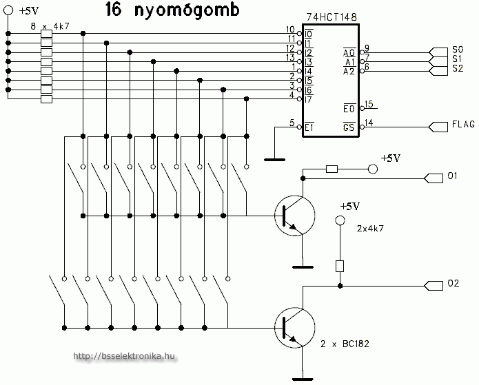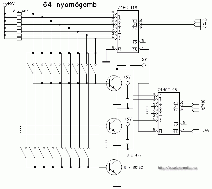 Ha az alsó 74HCT148 helyett 74HCT147 van berakva, akkor akár 8x9 gombotis lehet kezelni vele, mindenféle mikroprocesszor nélkül.