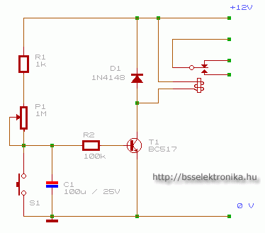 A rajzokon feltüntetett alkatrész értékekkel a második rajz (kikapcsolási késleltetés) maximális időzítése kb 1 perc, míg a másik két rajz esetén kb 15 s. Ennek oka: a 2. rajznál a kondenzátor 12 V-ról 1,2 V-ra sül ki, a másik két változatnál pedig 0 V-ról 1,2 V-ra töltődik fel. Ha hosszabb időkre van szükség, akkor a kondenzátor értékének módosításával lehet kísérletezni: minél nagyobb a kondenzátor, annál nagyobb lesz a késleltetés ideje.