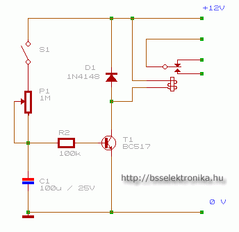 A jelfogó meghúzása a tápfeszültség megjelenése után késleltetve történik. Bekapcsoláskor ha a kondenzátor feszültsége meghaladja a tranzisztor BE küszöbfeszültségét, akkor a jelfogó meghúz. Ezután amíg a tápfeszültség jelen van, addig a jelfogó behúzva marad. Az S1 gomb hatására a kondenzátor kisül, és az elengedése után az előbb leírt késleltetési folyamat zajlik le.