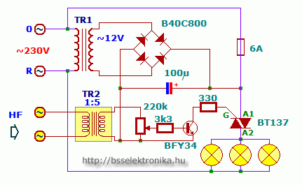 A TR1 trafó egy teljesen hagyományos 230/12 V-os hálózati transzformátor, minimális teljesítményű típus is megfelelő. A TR2 viszont fontos, hogy jó szigetelésű legyen, mert ez választja le a hálózati feszültséget a hangrendszerről.A primer tekercs impedanciája 100 ohm körüli értékű legyen, a feszültségáttétele pedig 1:5. Bármilyen méretű hangfrekvenciás trafó megfelel itt, a menetszámok annyiban fontosak, hogy ismerve a huzal fajlagos ellenállását, kijöjjön a primer oldalon a 100 ohm ellenállás és az 1:5 áttétel értéke meglegyen. A TR2 bemenetére a végerősítő hangszóró kimenetét kell kötni (párhuzamosan a hangszóróval). Nem kell aggódni a 100 ohm többszöröse a 4 vagy akár a 8 ohmos hangszórónak, semmilyen visszahatása emiatt nincs a hangrendszerre. A szabályzó poti mindenképpen műanyag kivitelű legyen.