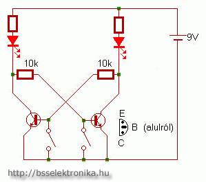 Tranzisztorként bármilyen npn szilícium tranzisztor megfelel, pl: BC109, BC182, BC547 stb Az *-al jelölt ellenállások értéke a LED fényerejétől függ, 330 - 1k közötti érték legyen. (a nagyobb ellenállás kisebb fényerőt eredményez)