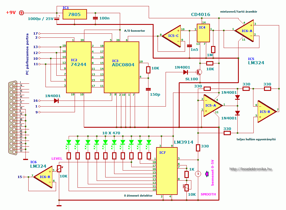 A bemenő jel az LM324 műveleti erősítőre és az LM3914 IC-re egyszerre érkezik. A tényleges analóg-digitális konverziót az ADC0804 IC, a 74244 pedig a PC párhuzamos port illesztését végzi. A PC párhuzamos portja a következő címeken érhető el: