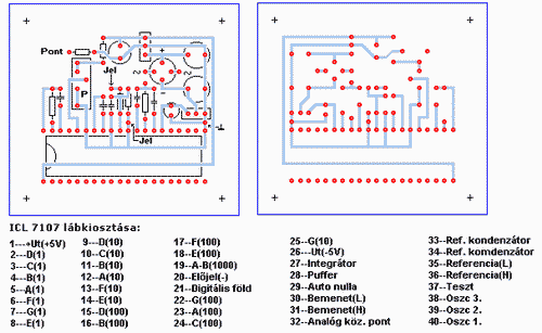 Pl: 1K esetén 200V-ot, 10K-nál 20V-ot. Közös anódos LED számkijelzőket kell alkalmazni, pl.: VQE14. Hitelesíteni a Potméterrel lehet. Jobb ha helitrimmert alkalmazunk, de a NYÁK-on két félének is van helye. A kész áramkör 1888 kijelzésnél kb. 200 mA vesz fel, a 7805-ös IC-re nem árt egy L alumíniumot rácsavarozni hűtésnek. A kijelzőket szalagkábellel kötöttem össze, egyszerűen a forrpontra forrasztottam rá. Az ICL7107 -est jobb ha foglalatba rakjuk, lehetőleg a lábát kézzel ne érintsük. Hitelesítést egyszerűen csináltam, egy gyári készüléket kötöttem mellé és összehasonlítottam.