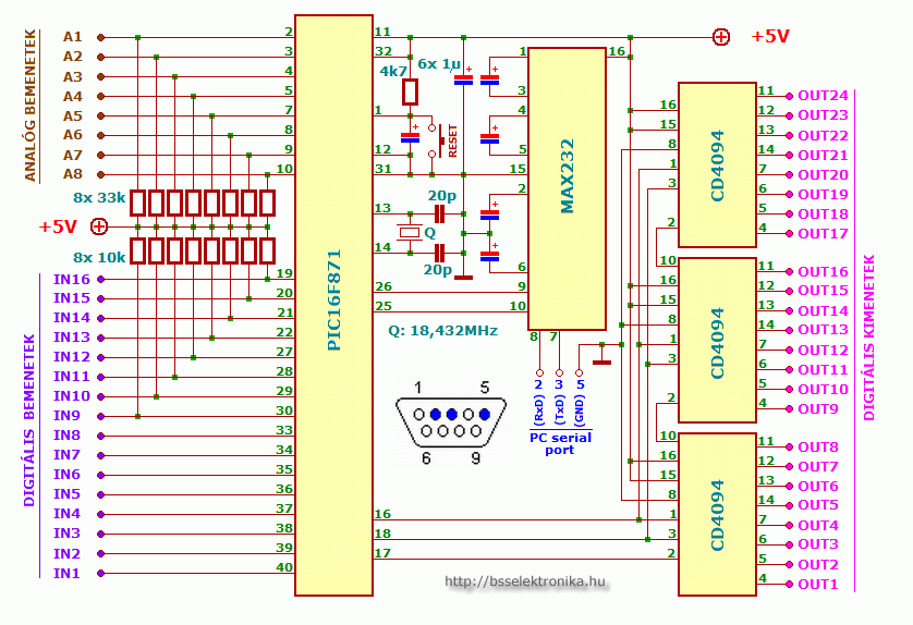 A kapcsolás lelke a 16F871 típusú PIC mikrovezérlő, ez veszi/adja az adatokat a MAX232 szintillesztő IC-n keresztül a PC-től. A bemeneteket közvetlenül érzékeli, a kimenő biteket pedig a 4094 típusú shift regiszter IC-re írja ki.