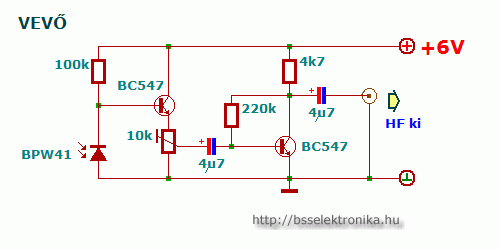 A BPW41 helyére bármilyen más, hasonló fotodióda is megfelel, vagy akár egy fotótranzisztor is. A vevő kimenetére egy kisebb erősítőt kell kötni, ami meghajtja a hangszórót. Az átvitt hang minősége szinte kifogástalan, teljesen élvezhető. Az áramkör egyetlen hátránya az, hogy az adónak és a vevőnek látniuk kell egymást.