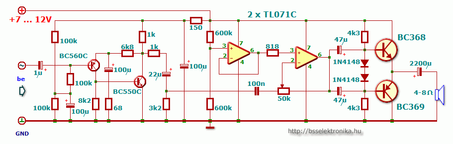 Az előbb sorolt erősítők IC-kkel működnek, és inkább a "cincogi"-kategóriás hangszórókkal lettek felszerelve, még ha kapcsolás szerint nem is rosszak, itt kivétel talán a 70-es évekbeli Busker, viszont ennek a fogyasztása a hátránya. A legjobban talán a Smokey tetszett, kicsi, cigidoboz-méretű cucc, jópofa külső, de borzalmas mylar-hangszóró. Ebből kiindulva egy szintén cigidoboz-méretű kapcsolást gondoltam, egy kisebb, szélessávú tv-hangszóróval. Persze egy kicsit megbolondítva pl. torzítóval, és a szebb hang érdekében egy tranzisztoros kapcsolás lenne előnyösebb egy olcsó ic-től. Volt már hasonlóm, de ott egy TBA820M volt a végfok B-osztályban, hát, hangerővel nem volt gond, de a minősége nem volt a legjobb. Az alábbi kapcsolás hangminősége sokkal jobb, mint az IC-seké, igaz, a kimenő teljesítménye valamivel kisebb, kb. 1W körül mozog, de gyakorláshoz, utcasarki pengetéshez kiválló. Itt megjegyezném, hogy kifejezetten utcára az 5W-os Vox DA5 és a Roland MicroCube erősítői talán a legjobbak, D-osztályú kapcsolástechnikájuk kitűnő hatásfokkal dolgozik, több beépített digitális effekttel, de az áruk azért zsebbe harapós. Ez meg tök analóg, AB-osztályú kapcsolás, és párszáz forint, dobozzal együtt.
