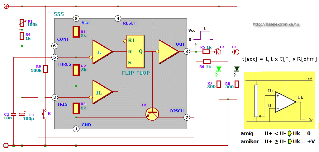 Az időzítés megkezdődik, C1 kondenzátor P1+R4 ellenálláson keresztül töltődik. Amikor kondenzátor feszültség eléri 2/3 Vcc-t I.Me kimenete magas értékre vált (mert U+=U-), ami flip-flop-t is váltja, annak kimenete ismét magas lesz, Tr kisüti C1-t és IC output alacsony szintre vált; az időzítésnek vége. Újabb időzítés csak K ismételt zárásával kezdődik.