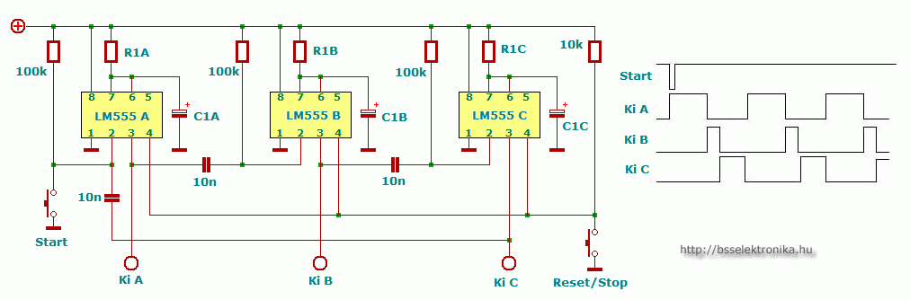 Az ábrában a 7 discharge láb be van kötve kondenzátorra, s az utolsó kimenet vissza van kötve első IC triggerére. Így monostabil oszcillátorként működik, de ha utolsót nem kötjük vissza, annak időzítése végén a rendszer leáll.