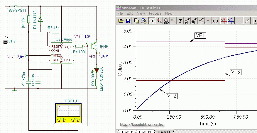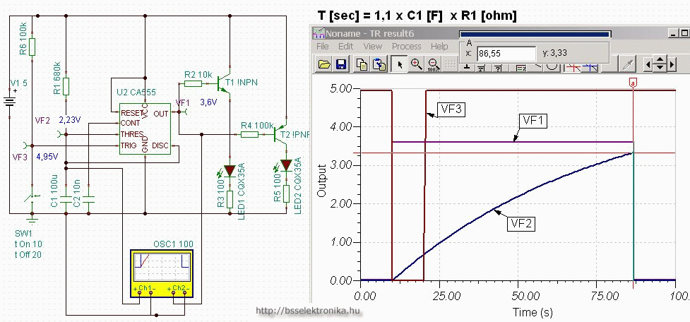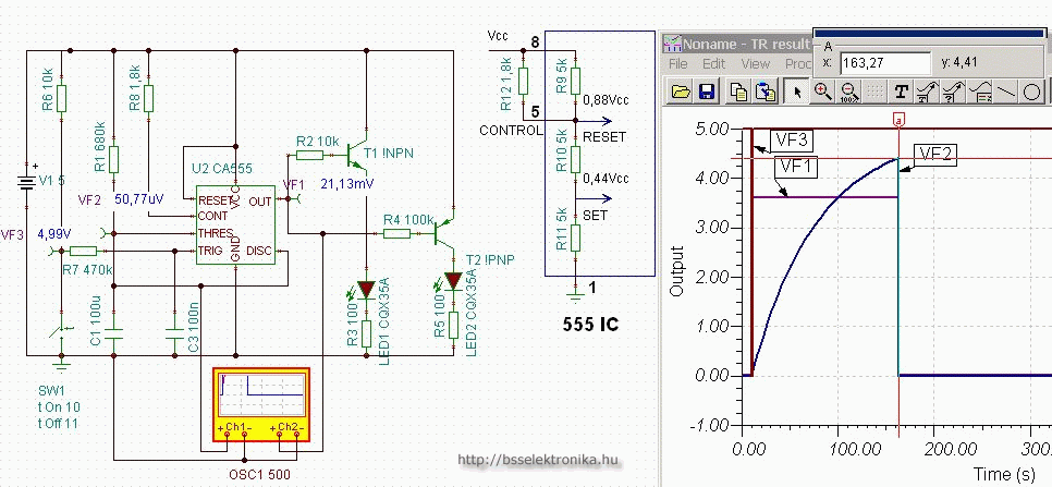 A szemléletesség miatt a triggert (VF3) 10-20 mp. között kapcsoljuk 0 feszültségre. Látszik, hogy a kondenzátor már bekapcsolás alatt is töltődött (VF2), de még nem érte el 1/3*5V-t, ezért II.Me és flip-flop váltása is létrejött. VF1, VF2 görbe metszése ugyancsak mutatja, hogy a kikapcsolás 2/3*5 = 3,33V-nál történt.555 IC magas szintű kimenete 5V tápnál kb. 3,6V, és terhelhetősége 200mA. Ez a rajz be és kikapcsolásra egyaránt jó, mert IC kimenete kétféleképp felhasználható, egyrészt NPN tranzisztor bázisára vezetve (vigyázzunk túl nagy ellenállás alkalmazásánál nem lesz elegendő bázisáram) az időzítés alatti magas jelet azonos fázisban erősítünk, azaz időzítés idejére bekapcsolunk, másrészt, ha ugyanezt PNP tranzisztor bázisára vezetjük, az időzítés alatt kikapcsol egy egyébként bekapcsolt áramkört. Ha kimenetről relét vezérlünk, ugyanezek a funkciók megvalósíthatók. Továbbá az idő változtatható, ha R1 helyén potmétert használunk.