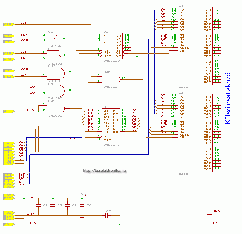 Az áramkört a PC ISA slotjában elhelyezhető kártyára lehet megépíteni. A két PPI összesen 48 programozható ki- bemenetet jelent, melyek minden portja külön programozható. A sárga csatlakozó pontok a PC ISA slotjának a megfelelő számú pontjai.