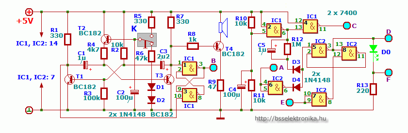A T1 és T3 tranzisztorok kollektoráról elvezetett jelet az 1-es és 3-as jelű 7400 IC NAND kapuiból felépített RS tároló formálja, és ez adja a kijelző egység órajelét adó B jelet. Az R10, R11 ellenállások és a C4 kondenzátor, valamint a 2-es jelű NAND kapu a bekapcsolási törlőjelet alakítja ki, amelyet a 4-es NAND alakítja át a szükséges polaritásnak megfelelő C jellé. Ugyanez a bekapcsolási törlőjel billenti be az R12 C5, D3 elemeken keresztül az 5-ös és a 8-as jelű NAND kapukból felépített tárat, amelynek eredményeként kigyullad a zöld színű LED, ami a számmező 0 számának felel meg.
