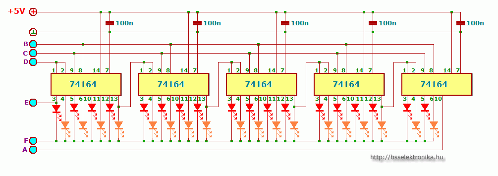 A futó golyó hatásról a 74164 típusú léptetőregiszterek gondoskodnak. Ezek soros bemenetű, párhuzamos kimenetű, 8 bites léptető áramkörök, melyek kimenetein egymás után sorban jelenik meg a logikai magas szint, ami mindig egy LED kigyulladását eredményezi. A beérkező C vezérlő jel következő impulzusa az éppen égő LED-et kioltja, a sorban utána következőt pedig bekapcsolja. Ez addig folytatódik, amíg a C jelet a T2 tranzisztor a már ismertetett módon le nem állítja. Zavarszűrés céljából minden digitális IC mellé, lehetőleg minél közelebb a táp lábakhoz egy-egy 100 nF kondenzátort érdemes odatervezni.