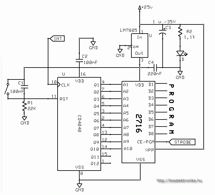 Ez egy EEPROM-EPROM programozó. Az Intel gyártmányú 2716 típusú IC-hez lett elkészítve, de bármilyen más memóriát lehet vele programozni, a lényeg az hogy maximum 10 biten címezzen, és párhuzamosan, mivel a CD4040 max enyit tud számolni binárisan! Ekkor természetesen a maradék két kimenetét is rá kell kötni az EPROM-ra.
