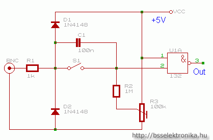 Egyszerű előerősítőAz első rajz nem is osztó, csak egy egyszerű előerősítő. Hogy a lehető legnagyobb érzékenységetállítsunk be, a nyugalmi szintet az R3 trimmerrel az U1A alsó és felső küszöbfeszültsége közé, középre kell beállítani.Ez az S1 kapcsoló AC (tehát kikapcsolt) állásában hatásos. A kapcsolás legfontosabb szerepe lehet a frekvenciamérő bemenetének védelme, amit az R1 ellenállás és a D1-D2 diódák látnak el. Frekvenciamérőhöz használható, annak bemeneti érzékenységének növeléséhez, és védelméhez. Az U1 típusa mivel kb 10-15 MHz körüli jelekről van csak szó nem lényeges túlzottan: jó a 74132, 74LS132, 74HCT132 is.