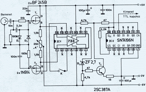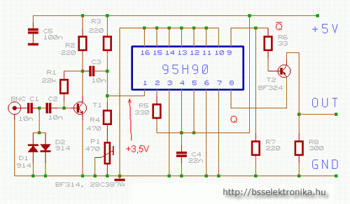 ElőosztókEz a kapcsolás már 10:1 arányban le is osztja a beérkező jeleket, mindamellett, hogy a bemenet védelemmel (D1, D2) is el van látva, valamint a jel erősítését is végzi. A jel erősítését a T1 végzi, a munkaponti áramát az R2 ellenállással lehet pontosan beállítani, aminek 8..10 mA közékell esnie. (az R2 ellenállással sorba kötött amper mérővel mérve) Ha pontosan be van állítva a munkaponti áram, és a T1 helyen GHz-nél magasabb határfrekvenciájú tranzisztor van, akkor 100 mV nagyságrendű jel már működteti az előosztót. A 95H90 típusú ECL előosztó maximális határfrekvenciája250..300 MHz közé esik, így a maximális frekvenciák esetén a kimenetén 25..30 Mhz frekvenciájú jel lép ki. Ez a jel TTL szintű és esetleg további felhasználáshoz még egy 10-es osztás szükséges lehet. 100 MHz felső frekvenciahatárt választva a kapcsolás egyszerűbb frekvenciamérőhöz használható, annak mérési tartományának kibővítéséhez.