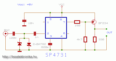 50 MHz határfrekvenciájú 10-es osztó áramkör:A következő kapcsoláson látható osztó áramkört főleg processzoros frekvenciamérőkhöz célszerű megépíteni, mert osztási aránya 1/64. A felső határfrekvencia 1,2 GHz! Az out kimeneten TTL szintű jel áll rendelkezésre.Az SP4731-el kompatibilis IC típusok: SDA4212 (Siemens), U664B (Telefunken), SAB6465 (Philips), SP6433(Plessey)