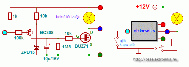 egy relével meg lehet oldani, hogy amikor rajt van a gyújtás (feltételezhetően jár a motor), akkor csak az ajtó nyitására világítson. Így kevésbé zavaró sötétben, ha vkit csak kiteszünk, vagy felveszünk. És ugyanezt a kapcsolást használom a kocsi kilincsének a megvilágításához, csak ott a centrál nyitó jele kapcsolja a lámpákat, és mivel a jel csak 1 mp-ig van, utána 7-8 mp után kialszanak.