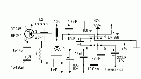Antenna: kb.: 25-30 cm-es vezetékdarab (valami vastagabb fajta), de teleszkópantenna is jó ide. Az antennát az L1 és az 1 nF közös pontjára kell kötni. (ez nincs rajta a rajzon)