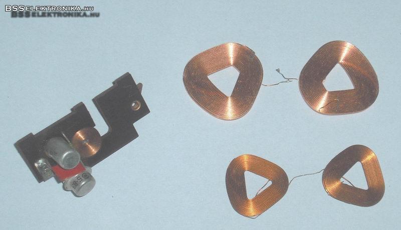 A fotó a vezetékkeresőben felhasználható tekercseket ábrázolja. Ezeket pl üzemképtelen floppy meghajtókból könnyen ki lehet termelni.Én egy rossz szovjet gyártmányú (Ruhla) elektromechanikus óra himbát működtető tekercspárját használtam fel erre. Helyette minél több, lehetőleg száz feletti mentszámú tekercs is jó. Ezt nagyon vékony huzalból is elkészíthetjük olyan méretűre, hogy az a dobozban elférjen. A fiókokban elfekvő tekercseket kipróbálva is találhatunk megfelelőt.