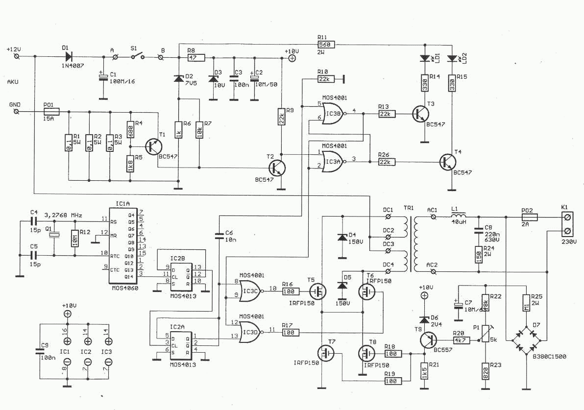 4001 típusú IC-k kapcsolgatják ellenfázisban a végtranzisztorokat. A T5-T8-at izolálva hűtőbordához rögzíteni. A trafó mezei 2x9V -> 230VAC, 160-200VA, legjobb, ha toroid. A PCB-n a terhelt részeket meg kell erősíteni rácinezett rézdróttal a keresztmetszet legalább legyen 1,5 mm2. A beültetés után az élesztés trafó nélkül, szabályozott táppal, 8,5V alatt. a piros led (LD1) világit, utána a P1-el bealítani a 230VAC kimeneti feszültséget..160VA-hoz úgy 12 V-ról kb 15A kell! Az