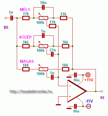 A műveleti erősítőként 741-es IC is megfelel, de ha igényesebbek vagyunk a hangminőségre, akkor korszerűbb műveleti erősítőt kell alkalmazni. Sztereo rendszerbe kettőt kell építeni a kapcsolásból, és sztereo potmétereket kell alkalmazni. A bemenetre érdemes tantál-kondit tenni.