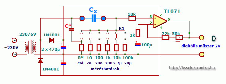 A mérőosztóról levett jel a TL071 IC +invertáló bemenetén lévő 10k-s ellenállás Cx felőli végén max 40 mVeff lehet. Mivel a hálózati frekvenciát (50 Hz)használjuk mérőjelként annak nem stabil volta (+-10%) miatt minden mérés előtt kalibrálni kell ezt az R* C* biztosítja. A C* bármely értékű 0-2 μF közé eső 1% alatti tűrésű stabil kondenzátor, az R* pedig méréshatárban ehhez tartozó 1%-os fémréteg ellenállás. Tehát mérés előtt kalibráció állásba kapcsoljuk a K1-et majd az 50 k-s potméterrel beállítjuk a digitális műszeren (2 Veff méréshatár) az etalon kondenzátor értékét.