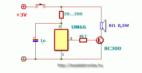 Hali!Csak szólnék, hogy ez így nem túl jó megoldás, mert csak addig fog zenélni, amíg nyomják a gombot. Csengőnek az UM66T__S -sel végződő chipek jók, mert azok egyszer végigjátszák a dallamot és leállnak. Persze a kapcsoláson is némileg változtatni kell, mert az S-eseknél egy soros ~330ohmos ellenálláson keresztül kapja a tápfeszt az IC, és a csengetést(dallamot) úgy kell elindítani, hogy a tápfeszültség lábakat a csengőgomb rövidrezárja (reseteli a chippet), a gomb elengedésekor 1x végigjátsza a dallamot. Ha lejátszás közben újra csengetnek, akkor a dallam újrakezdődik.A fenti kapcsolás zenélő képeslapokban szokott lenni.Nem kötözködés képpen írtam. Jó építgetést!