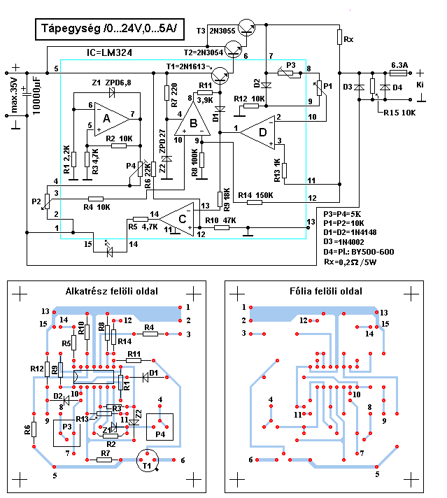 Az Rx 0,2 ohmos huzalellenállás az áramkorlátozó figyelő ellenállása. D komparátorként üzemel, nyugalmi állapotban kimenete az LM324 27V-os tápfeszültségére van kiakadva. Az áram limitáció megszólalásakor kimenő feszültsége 0-ra esik és az 1-es lábra kötött 1 N4148-as diódán át lezárja a soros áteresztő elemeket. Az LM324 utolsó, C részerősítője vezérli az áramlimitációt kijelző LED-et. Nyugalmi állapotban a D kimenetén levő magas szint miatt C kimenete 0-n van (a 13-as invertáló bemenet). Áramlimitációkor C kimenete 27V-ra ugrik és a LED begyújt.
