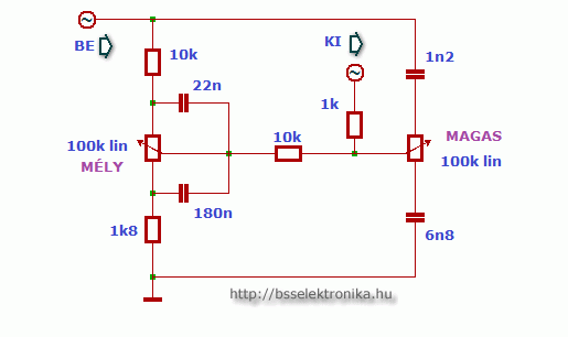 Igen, a szűk határok közötti működés abból ered, hogy ez egy passzív hangszínszabályzó, azaz azzal operál, hogy a különböző frekvenciájú összetevőket különböző mértékben engedi át vagy nyomja el. Sokkal tágabb szabályzást tesz lehetővé, ha aktívat építünk, ami általában tr-os vagy me-ős alapkapcsolás frekvenciafüggő visszacsatolással. Ezeknél ugyanis az erősíté mértékét szabályozzuk a frekvenciafüggő visszacsatolással. Alapkapcsolásnak egyébként szerintem is jó, egyszerűbb, igénytelenebb feladatokhoz kiváló, nyák nélkül megépíthető a potikra forrasztott alkatrészekkel.Szép estét mindenkinek: Abureka