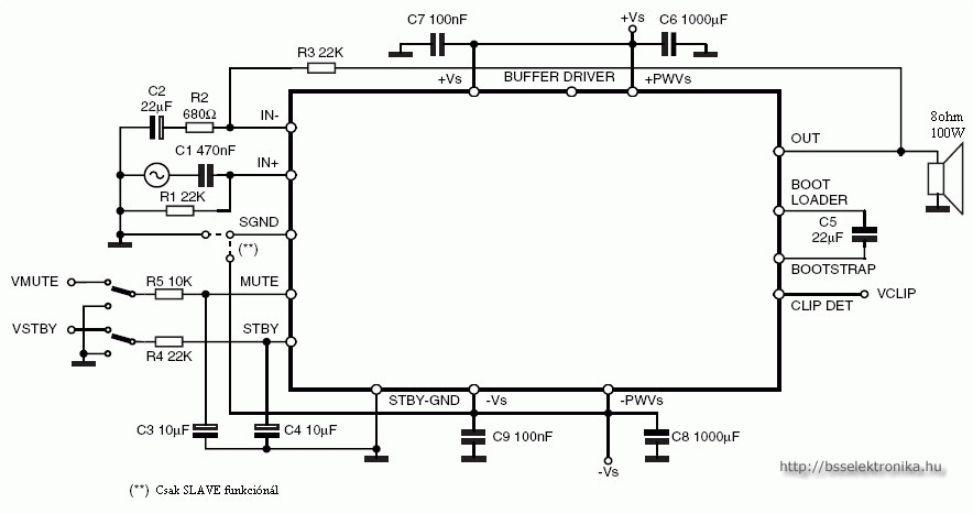 Mute és Stand-by üzemód is található az IC-nek köszönhetően. A teljesítmény miatt mindenképpen szigetelve hűtőbordára kell szerelni! A TAB a 8. lábnak felel meg. Ez az IC más kapcsolásban 2 x 200W illetve 1 x 400W -os kivitelben is megépíthető. Az erősítő szimmetrikus +-10V és +-40V között üzemeltethető! Az erőerősítő részének viszont stabil 5V feszültség szükséges. Ez még arra is jó ha esetleg ledekkel szeretnék díszíteni alkotásunkat :)