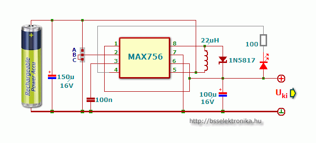 Ha a B és C pont van összekötve, akkor a kimenő feszültség 5V, az AB összekötése esetén pedig 3,3V. Az IC 4-es lábára kötött szürkével jelzett áramkör az alacsony tápfeszültségre figyelmeztet, 1,25V alatt a LED világít. Ez csak ceruza elem esetén érdemes használni, ceruzaakkunál nem megfelelő, mivel azok teljesen feltöltött állapotban is csak 1,2V körüli feszültséget szolgáltatnak.