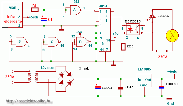 Továbbá ez már az én ötletem de én betennék egy LM567-es szűrőt a inra jelvevő/erősítő és a 4093as ic közé a bemenethez hogy csak X hz es jelre reagáljon. Így már lehetne akár többcsatornás is. Reléhez építem énis. Skori aztmondta tegyek a triak A1 és A2 lába közé sorbakötve egy 47ohm 1W körüli ellenállást és egy 220nF 230V kondit. Ez védi a tekercs visszarúgásától. Ezenfelül optotriakot használjak (min.400V) NE tranyósat. A kimenete és a triak vezérlőlába közé kb 200ohm ellenállás.