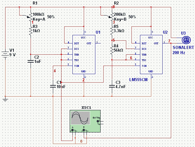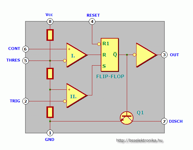 Első időzítőt használja mint monostabil (egyimpulzusos) vibrátort, ami meghatározza a Trigger + impulzusával kapcsolt hang időtartamát. Az 1. által kiadott magas (+) idő alatt a 2. időzítő mint astabil (sorozatimpulzusos) vibrátor működik, ahol a hang frekvenciáját lehet beállítani.