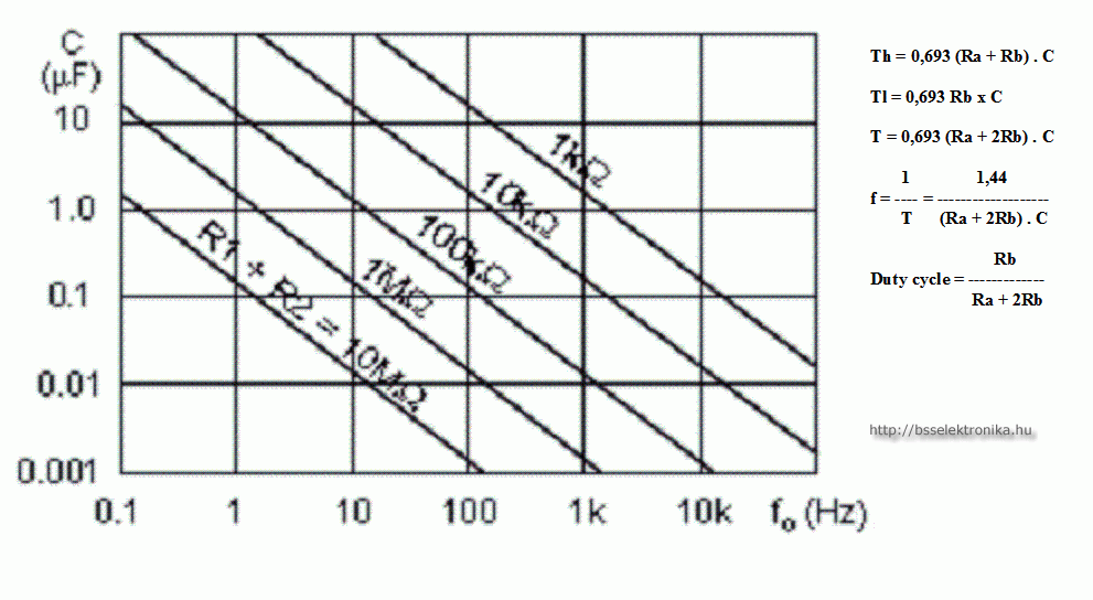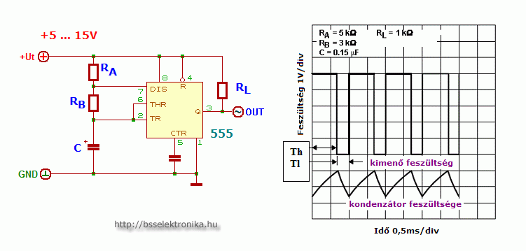 Amikor az ábra szerint a THRES és a TRIGGER össze van kötve a TRIG önmagát kapcsolja a C kondenzátor feszültségszintjétől függően, azaz szabadon fut és sorozatosan kapcsol. (Multivibrál)C kondenzátor Ra + Rb ellenállásokon keresztül 1/3 - 2/3 Vcc között töltődik, felső küszöb elérése után Rb ellenálláson keresztül kisül. A kapcsolási folyamat ugyanaz mint előbb, azaz TRIG alacsony feszültség küszöbnél átkapcsolja F-F-t, és ez kikapcsolja DISCH Q1 tranzisztorát (töltődés = magas OUT), magasnál meg THRES kapcsolja vissza F-F-t és DISC keresztül Q1 kisüti C-t. (kisülés = alacsony OUT) A töltés Th és kisülés Tl idejét az ellenállások és a kondenzátor határozza meg, ami nem függ a tápfeszültségtől.(?)Ezek és a frekvencia, valamint a kitöltési tényező (alacsony OUT szintidő aránya a periódusidőhöz) az alábbiakból számítható: