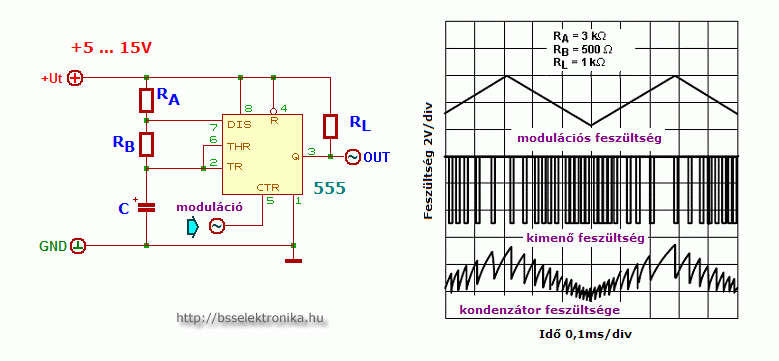 A kapcsolás egy astabil multivibrátor, ahol a CONTROL-ra változó feszültségű jel érkezik, ami módosítja az I. komparátor kimenő küszöbfeszültségét az IC belső feszültségosztóján lévő feszültség megváltoztatásával. Emelkedő CON feszültségre nő a küszöbfeszültség, mert I. komparátor invertáló bemenetén van ( C hosszabb ideig, nagyobb feszültségre tölt), ezért az OUT magas szintje tovább tart. Csökkenő CON feszültség, alacsonyabb küszöb, rövidebb pulzus. A CON-ra beérkező feszültségjel változás bármilyen lehet Vcc határán belül. A moduláló feszültséget a CONTROLL bemenetre kapacitív csatolással célszerű kapcsolni. A modulációs forrás feszültség és impedancia közvetlen csatolásnál az időzítő eltérését figyelembe kell venni.