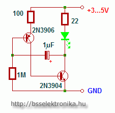 Kálmánnak: Ahhoz, hogy +12V-ról működjön a LED előtét ellenállását cseréld nagyobbra (kb. 1 kOhm) és lehet hogy a 2N3906 PNP tranyó kollektor ellenállását is valamivel nagyobbra. Ha az ellenállás helyére potmétert rakunk, máris egyből lehet a villogás frekijét szabályozni.