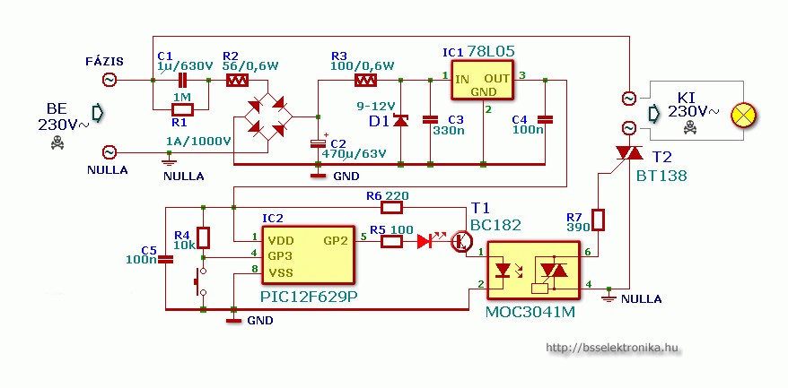 Ez egy egyszerű lépcsőházba való világítás ami a gomb megnyomása után 1,5 percig világít és utána kialszik. A kapcsolás megépítésénél ügyeljünk a hálózati pontokra mivel feszültség alatt veszélyesek lehetnek ha rossz helyre nyúlkálunk. Élesztésnél vegyük ki a PIC-et a foglalatból és mérjük meg az 1-es és a 8-as láb közötti feszültséget. Ennek 5 voltnak kell lennie.