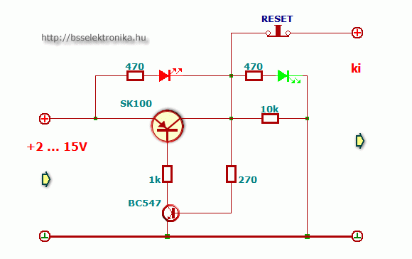 Helló,A bal oldalára rákötöd a tápodat.A piros LED elvileg felvillan egy pillanatra kinyit az NPN tranzisztor ami kinyitja az áteresztő tranzisztort (PNP). Még a terhelésen nem folyik túl nagy áram-kb100mA (jobb oldal) addig a zöld LED világít. Ahogy nő a terhelés egyszer kigyullad a piros is.És ha még tovább nő, akkor elkezd bezárni az NPN (mivel földpotenciál felé húzza a terhelés) a zöld elalszik, és bezár az áteresztő tranzisztor. A Terhelés megszűnéséig a kimeneti fesz. közel 0. Így a táp nincs túlterhelve. Ez a kapcsolás nagyon kicsi áramokat képes figyelni,de:az 1K-t lecseréled 100ohm-osra, és a 270-et 680, az SKK100-ast TIP42-re kb 900mA.nél fog csak leszabályozni..De kísérletezni kell vele illetve az értékekkel..Remélem segítettemÜdv