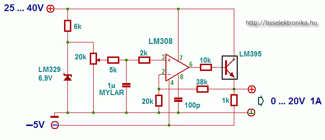 A kapcsolással például nagyobb áramú tápegységek referencia feszültsége állítható elő, de akár tápegységként is funkcionálhat 1A terhelésig. A pontos kimenő feszültség értéke a potméterrel állítható be.