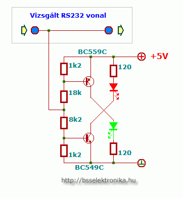 A számítógép soros vonalainak vizsgálatára alkalmas a kapcsolás. A két tranzisztor szintillesztést végez a soros vonali jelszintekről. Érdemes a kapcsolásból annyit megépíteni, ahány jelet vizsgálni akarunk.